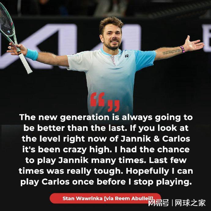 其它场次:前赛会冠军、瑞士老将瓦林卡以7-5 6-3击败黎巴嫩球员哈桑,收获开门红。此役过后,瓦林卡还刷新了一项纪录,这就是成为ATP历史上年满40岁之后,取得巡回赛胜场数最多的球员(10场)。赛后,四蛋在接受采访时表示,希望在自己这个最后赛季里,能与世界第一阿尔卡拉斯交手,“新一代球员总是比上一代更强。看看现在扬尼克和卡洛斯的水平,简直高得惊人。我有幸和扬尼克交手过很多次,最近几次都非常艰难。希望在我退役之前还能和卡洛斯打一次。”